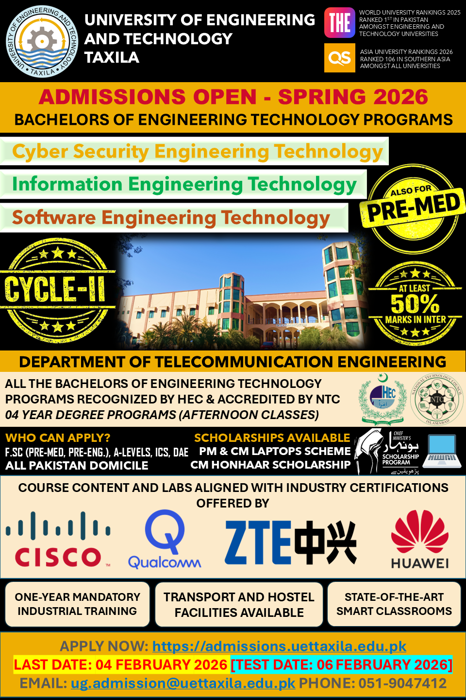 - UET Taxila is offering BS Computer Science (AfterNoon) Program Fall - 2025 View Advertisment
