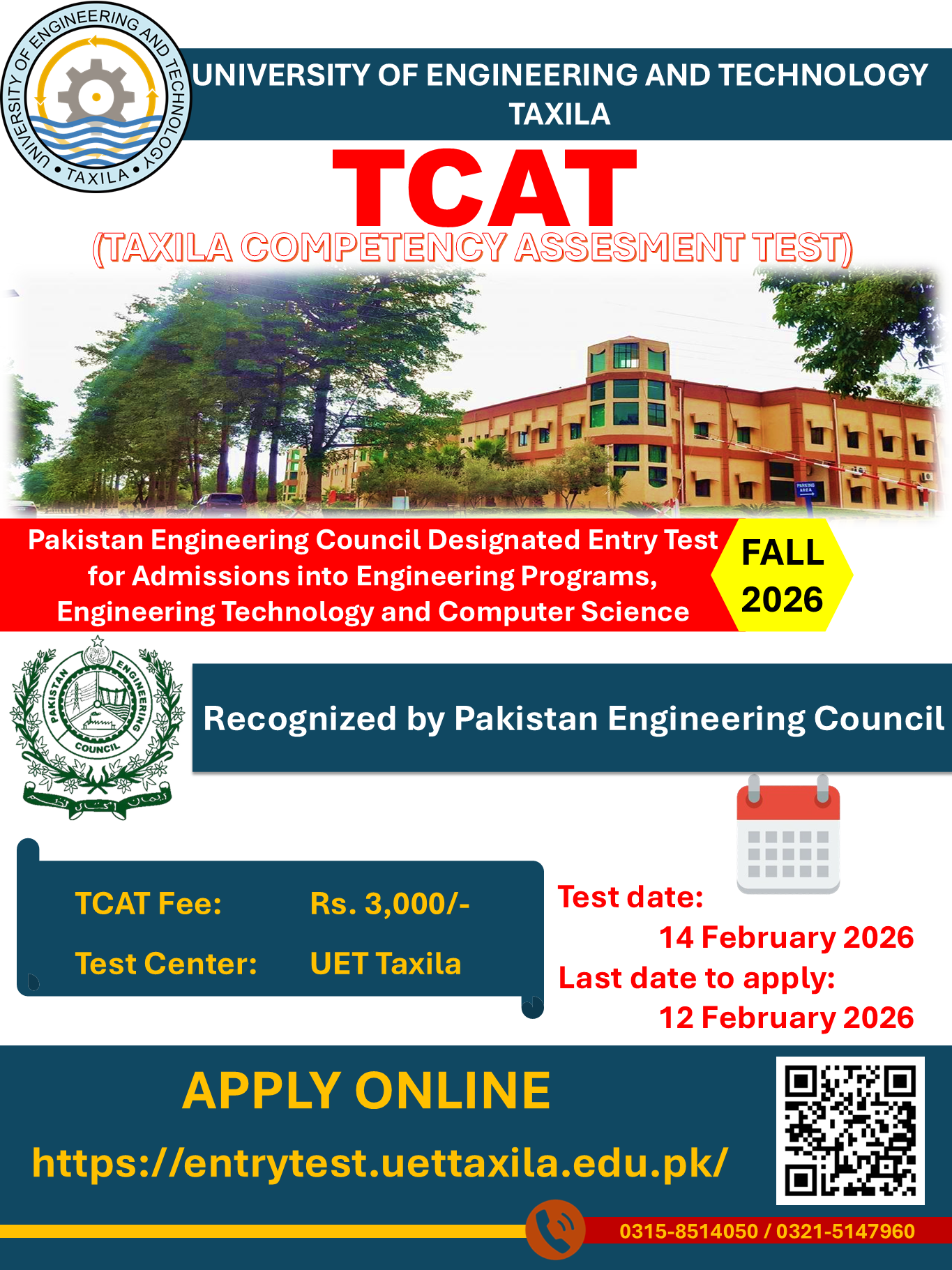 - UET Taxila Entry Test (TCAT-I) Portal Click Here.